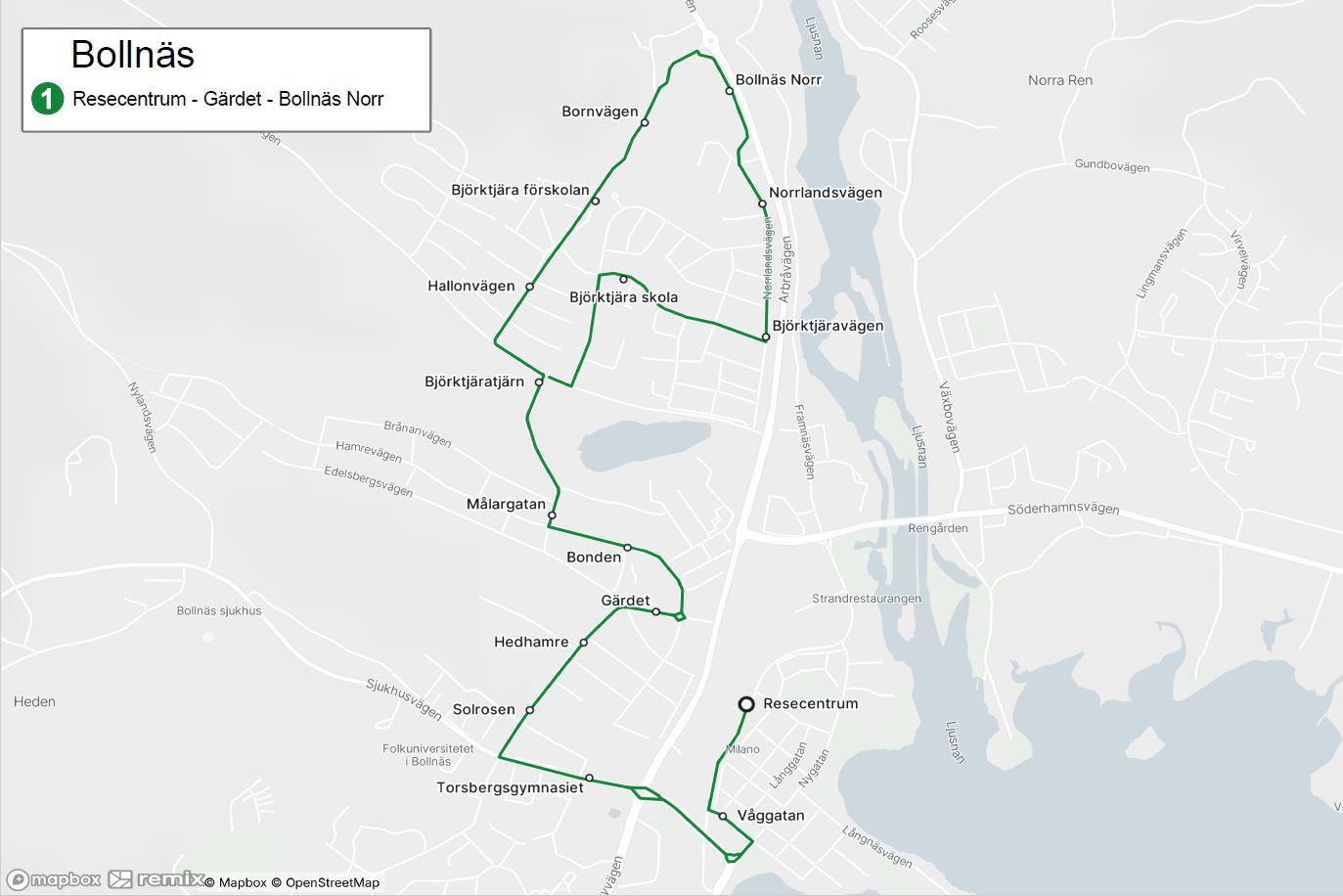 Resecentrum - Våggatan - Gärdet - Bollnäs Norr - Gärdet - Våggatan - Resecentrum (bussen kör sedan vidare mot Ren som linje 2)