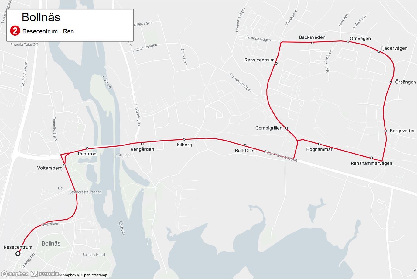Resecentrum - Voltersberg - Kilberg - Ren - Kilberg - Voltersberg - Resecentrum (bussen kör sedan vidare mot Granberg som linje 3)