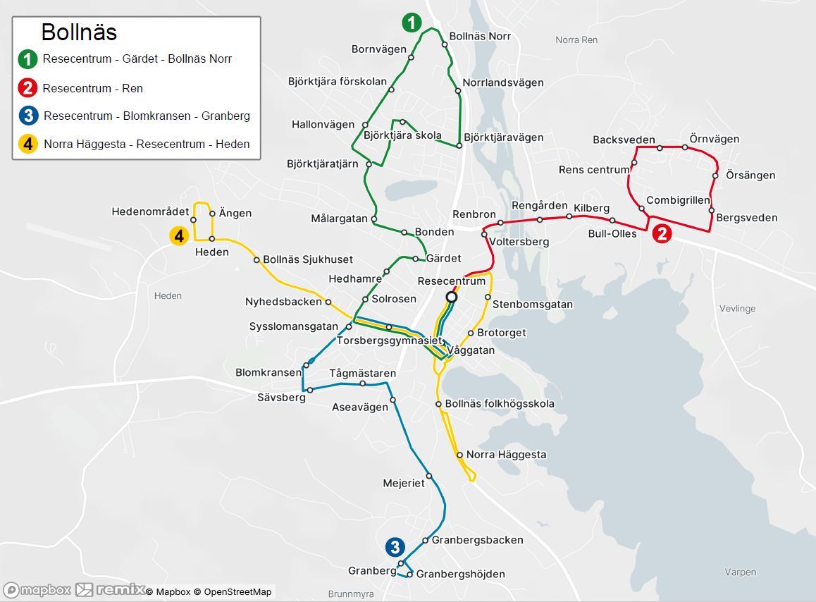 Samtliga stadslinjer kör via resecentrum, som är knutpunkten för all buss- och tågtrafik i Bollnäs. Linje 1, 3 och 4 har en hållplats på Våggatan i centrum, endast linje 4 har en hållplats vid Brotorget i centrum. Busslinje 2 som kör till Ren kommer inte att köra in vid Karlslund vilket innebär att hållplats Karlslund försvinner.